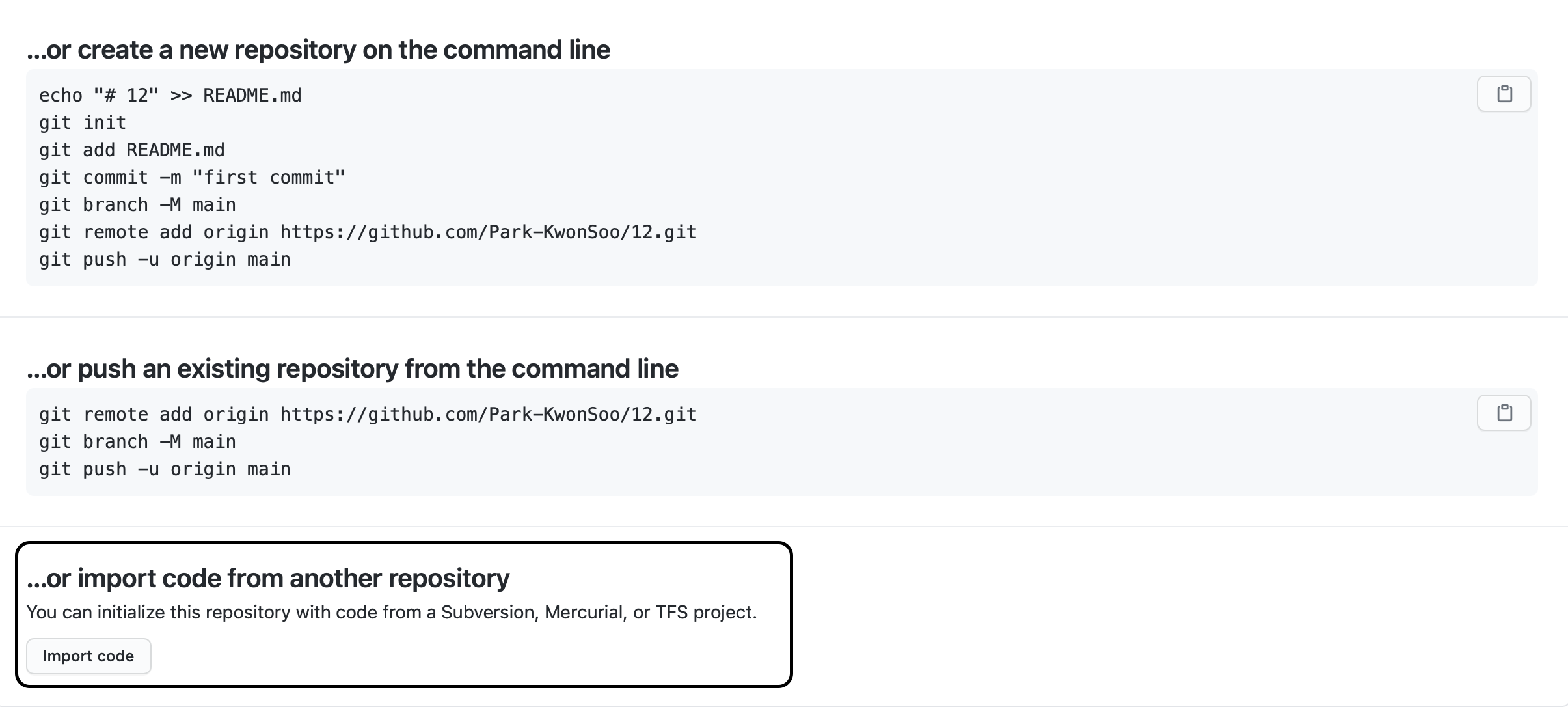 레포지토리를 생성하고 하단으로 내려가면 박스 친 부분처럼 import code를 할 수 있는 곳이 있다.